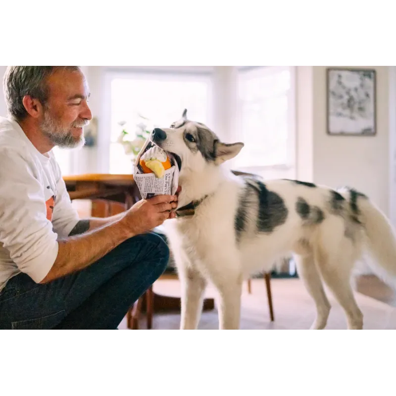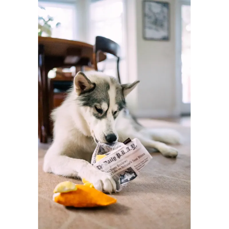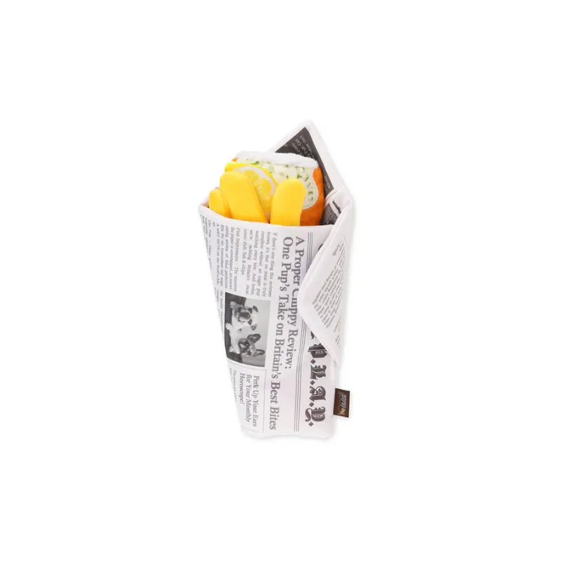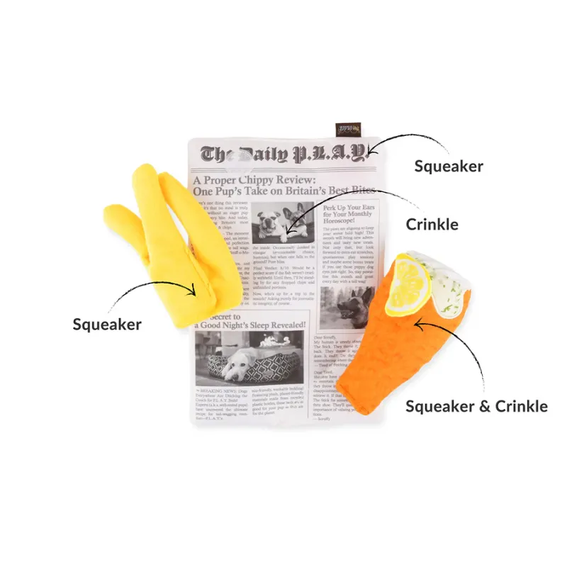 Divertido juguete de peluche con forma de trozo de pescado con patatas fritas envueltos en papel de periodico, con piezas extraíbles, sonidos squeaker y efecto crujiente que estimulan el juego interactivo.