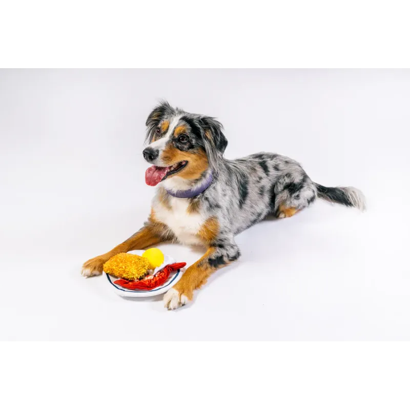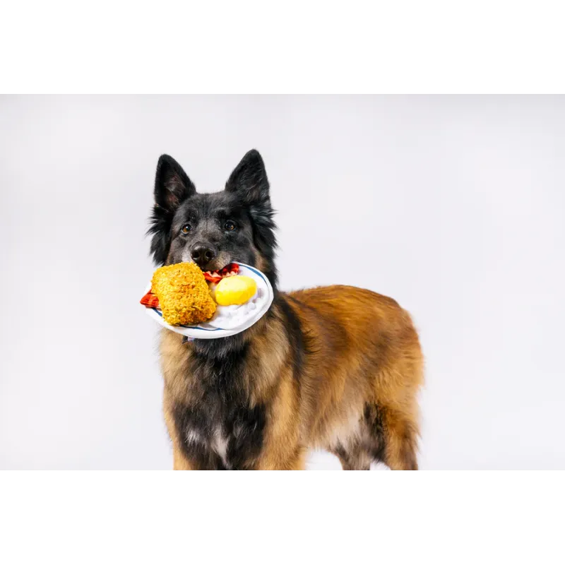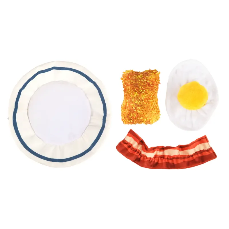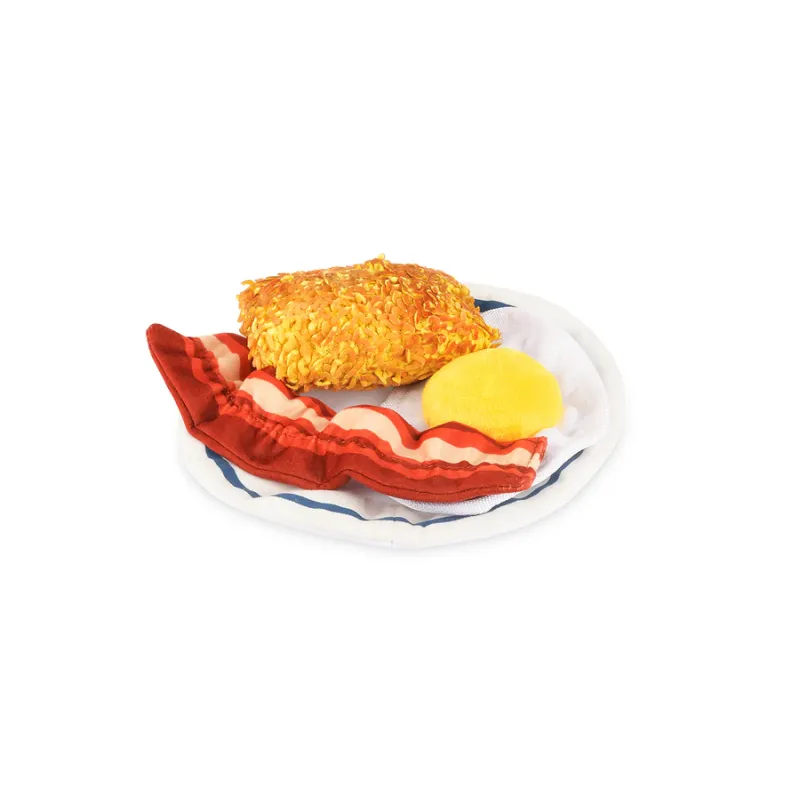 Divertido juguete de peluche tipo desayuno completo, con varios elementos desmontables como huevo, bacon y hashbrown, con squeakers y texturas crujientes que estimulan el juego interactivo.