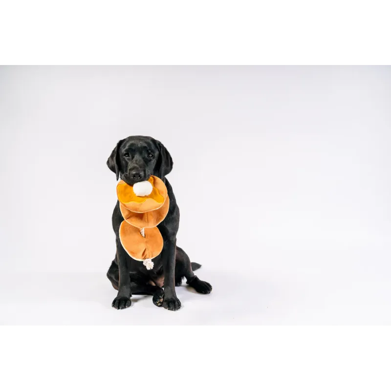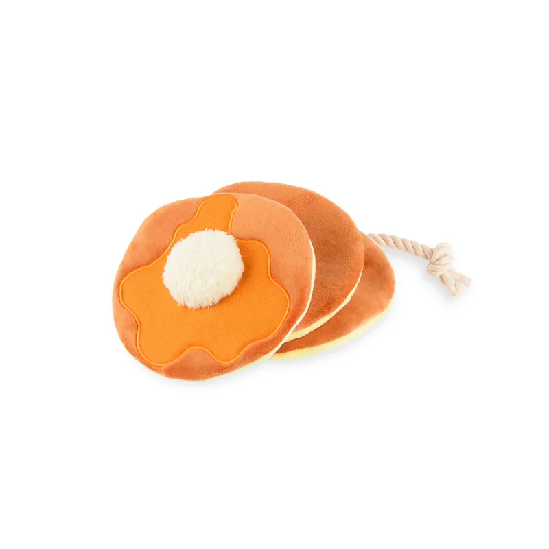 Divertido juguete de peluche con forma de torre de pancakes, con piezas unidas por cuerda deslizante que lo hacen ideal para juegos interactivos como tirar y traer.