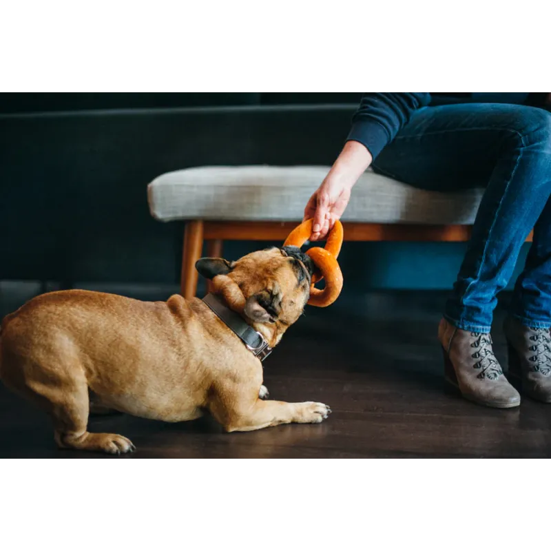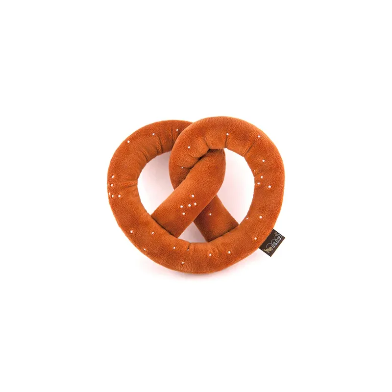 Divertido juguete de peluche con forma de pretzel, con squeakers interiores y diseño flexible que facilita el agarre, el lanzamiento y el juego interactivo.