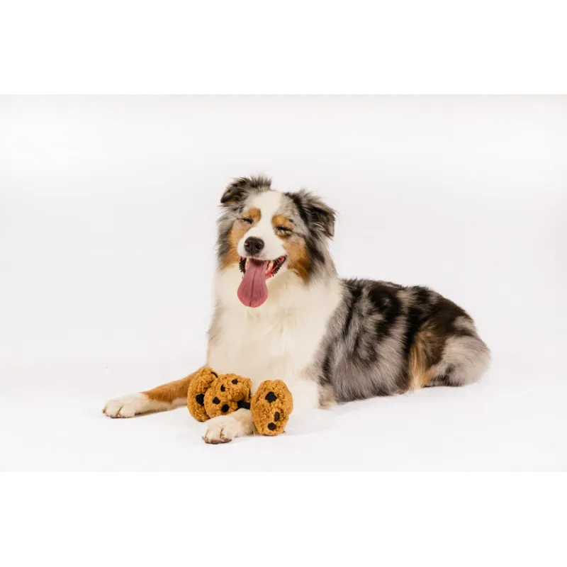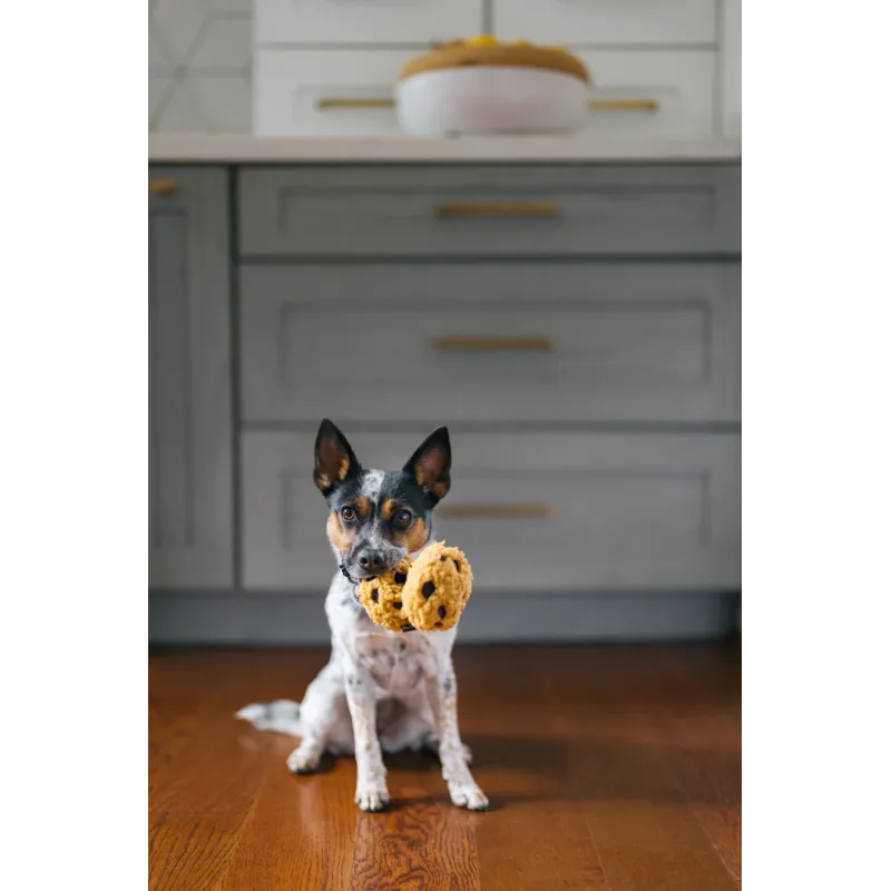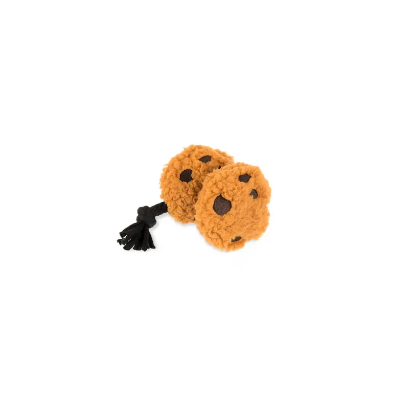Divertido juguete de peluche con forma de galletas unidas por cuerda, con múltiples squeakers y efecto crujiente que estimulan el juego interactivo y el tira y afloja.