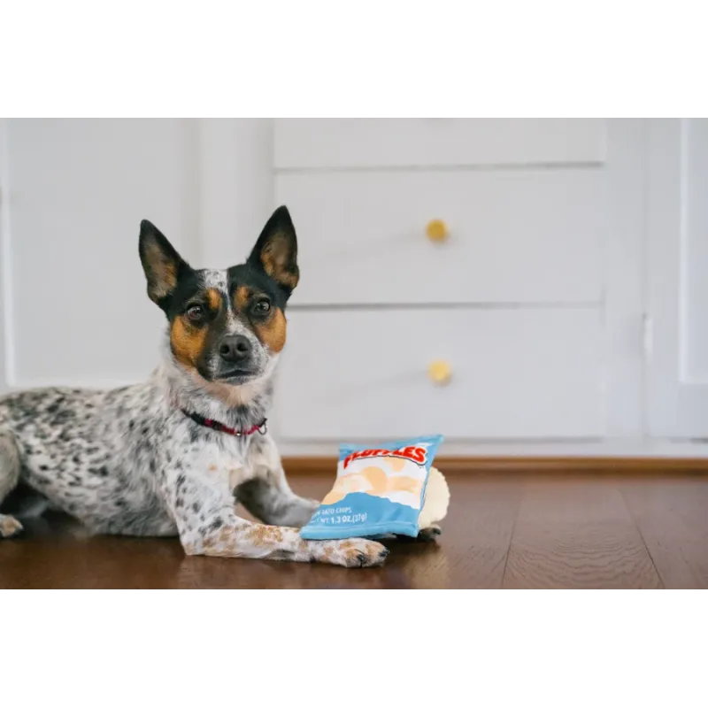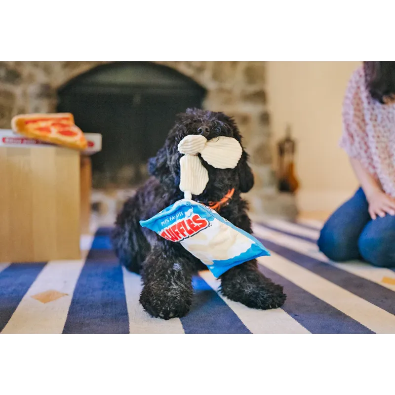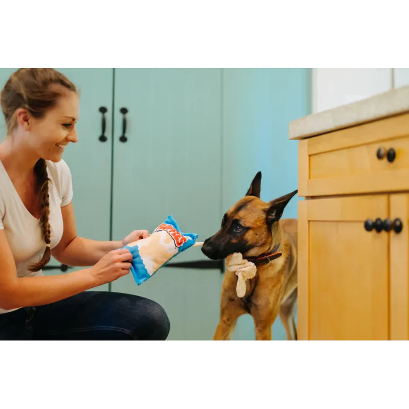 Divertido juguete de peluche con forma de bolsa de patatas fritas, con elementos crujientes y múltiples squeakers que estimulan el juego interactivo.