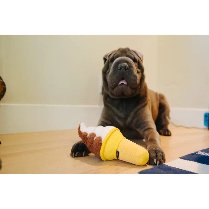 Divertido juguete de peluche con forma de helado soft , que incorpora sonido tipo “giggle stick” y base crujiente para estimular el juego interactivo.