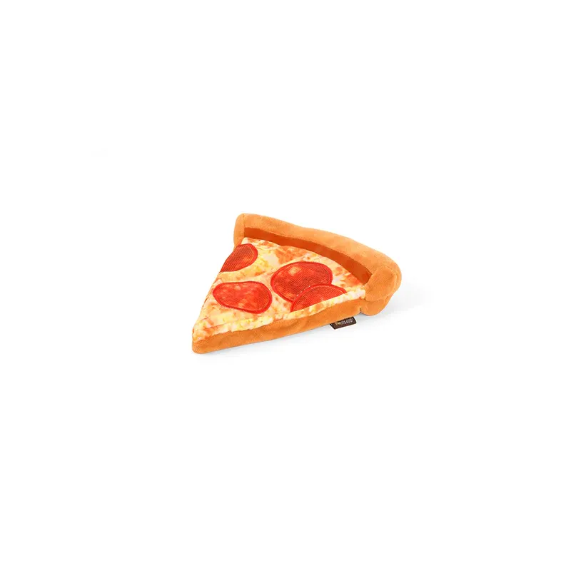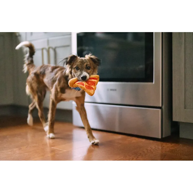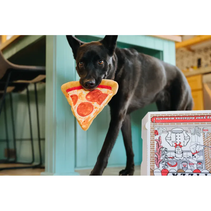 Divertido juguete de peluche con forma de porción de pizza, diseñado para estimular el juego gracias a sus múltiples squeakers y texturas interactivas.