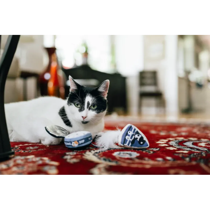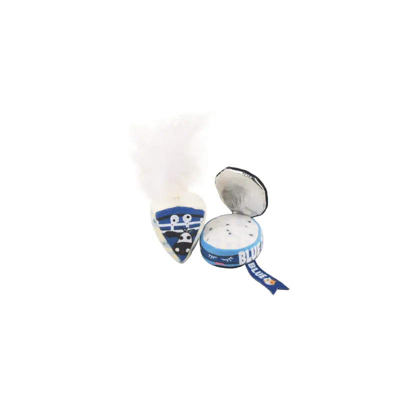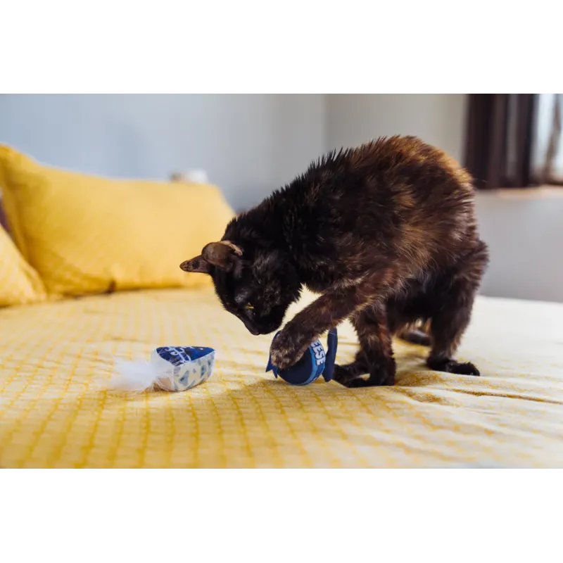 Divertido juguete de peluche con forma de queso, relleno de catnip orgánico y con efecto crujiente que estimula el instinto de caza y mantiene a tu gato activo y entretenido.