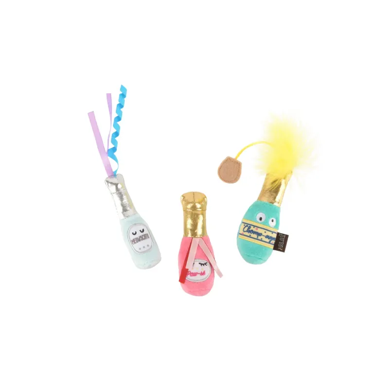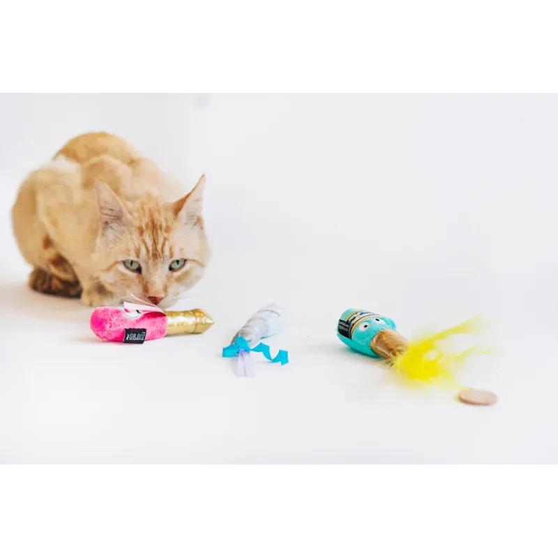 Divertido set de juguetes de peluche con forma de botellas de bebidas, con catnip, cintas y texturas crujientes que estimulan el instinto de caza y juego de tu gato.