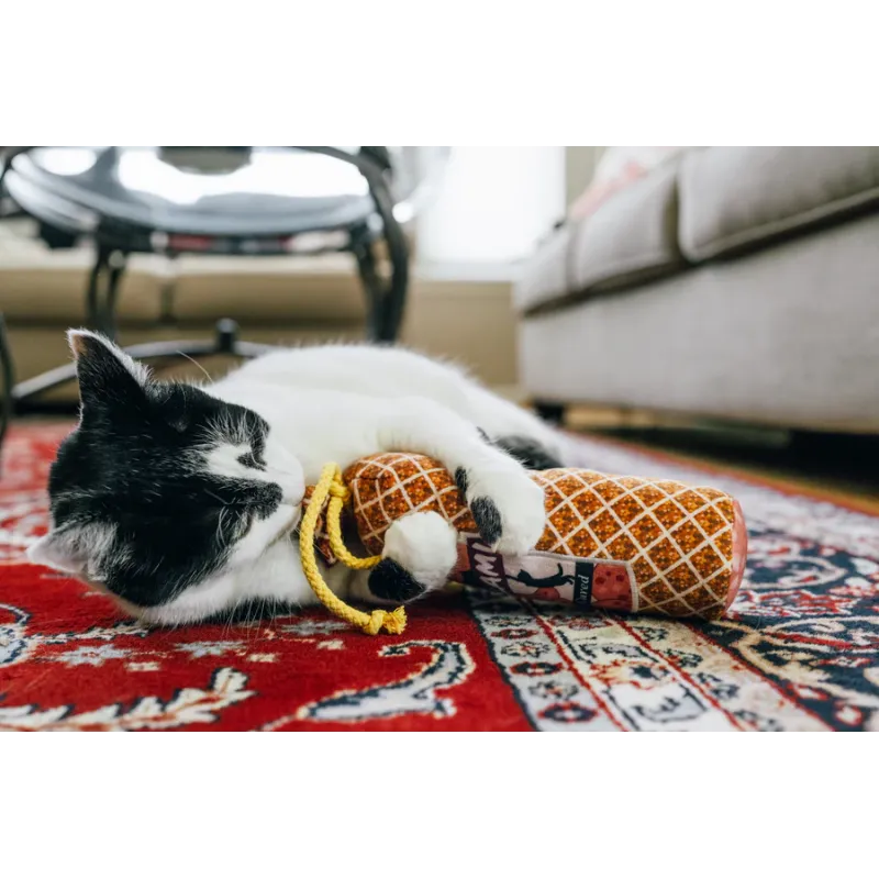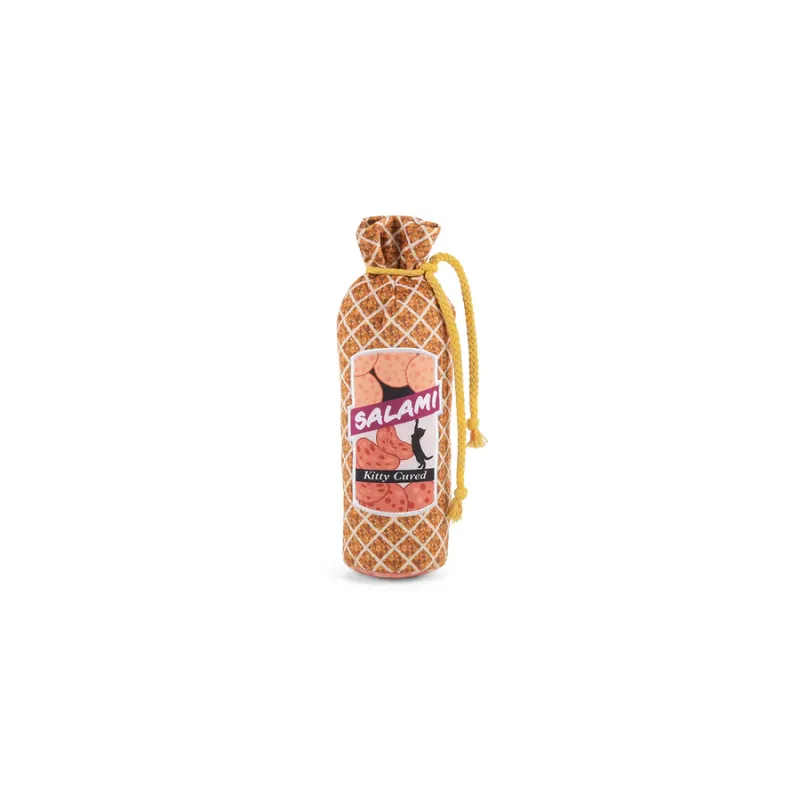 Divertido juguete de peluche tipo kicker con forma de salami, con catnip orgánico, efecto crujiente y tamaño ideal para morder, patear y estimular el instinto de caza.