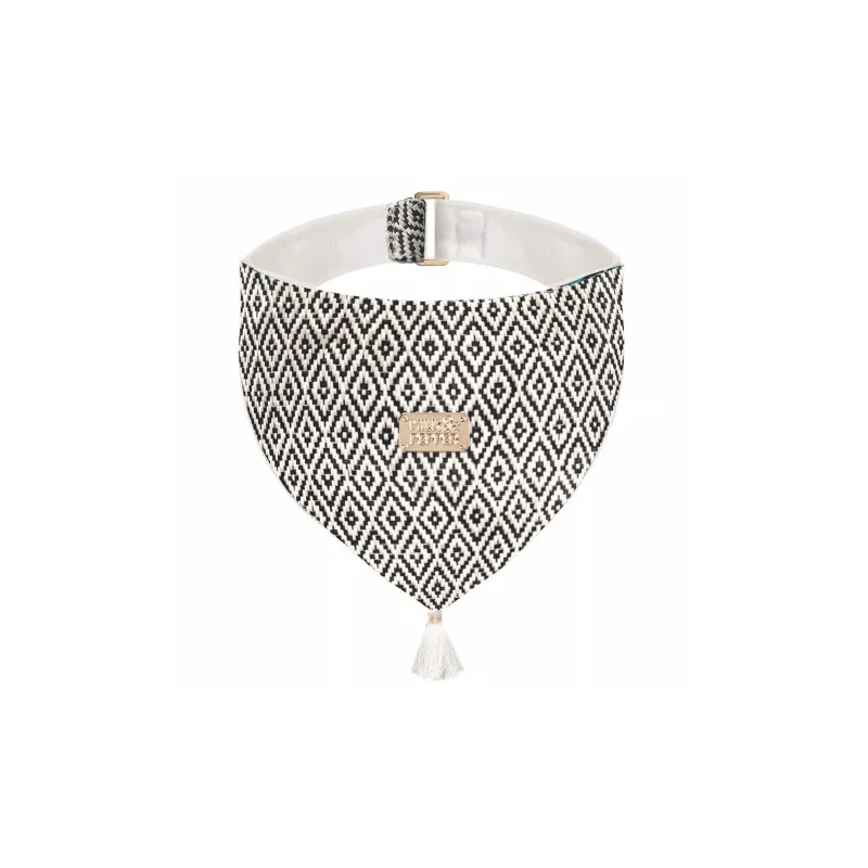 Esta bandana está confeccionada en tejido con trenzado geométrico en colores negro y crudo, ofreciendo un acabado original y de tendencia. Incorpora un forro interior en interlock en tono crudo que mejora la suavidad en contacto con el cuello del perro. Dispone de cierre ajustable mediante velcro y hebilla metálica dorada, permitiendo adaptarse cómodamente. Incluye además una pequeña placa metálica “Milk&Pepper” y un detalle decorativo tipo pampilla que refuerza su estilo distintivo.