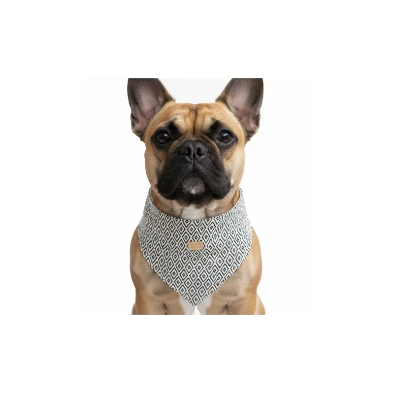 Con su diseño en tejido con motivos geométricos en tonos negro y crudo, esta bandana combina estética y comodidad, convirtiéndose en una opción ideal para completar el outfit diario de tu mascota con un aire sofisticado y actual.