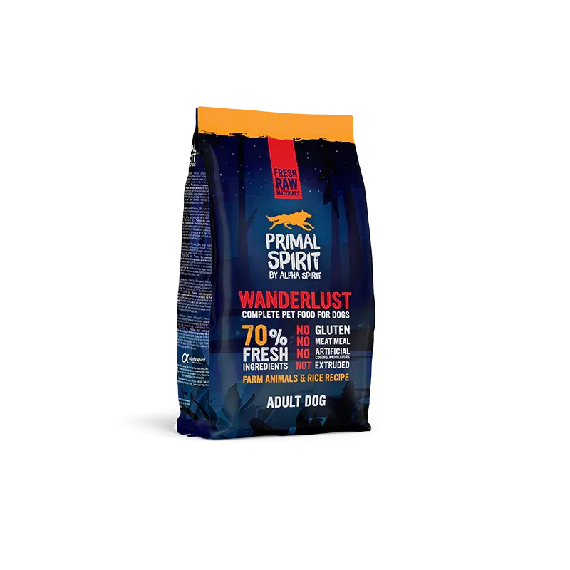 Primal Spirit Wanderlust es un alimento completo para perros adultos elaborado con una combinación de carnes frescas de animales de granja, proporcionando una nutrición equilibrada, sabrosa y altamente digestible. Su receta con arroz aporta energía de fácil asimilación, ideal para el día a día.
