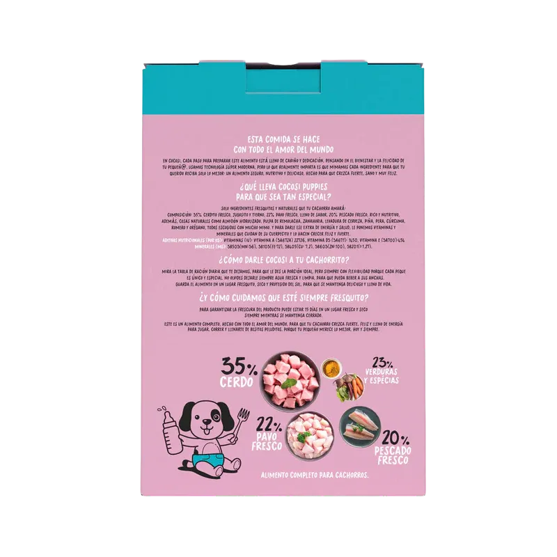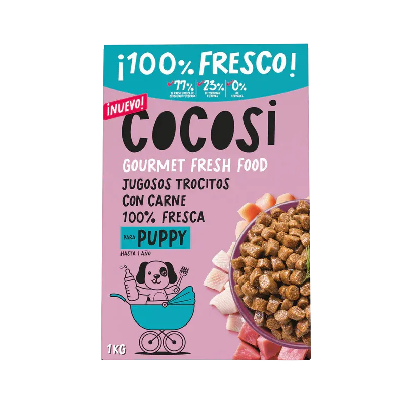 COCOSI Gourmet Fresh Food Puppy es una receta especialmente pensada para cachorros, elaborada con jugosos trocitos y carne fresca para acompañar su crecimiento desde los primeros meses.