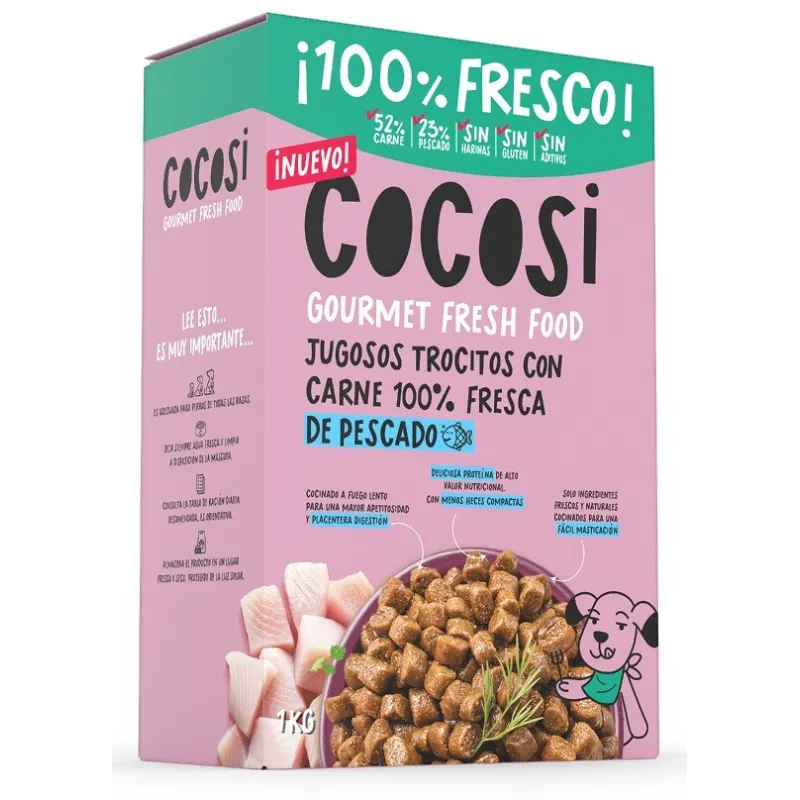 COCOSI Gourmet Fresh Food con pescado es una deliciosa receta elaborada con jugosos trocitos y pescado como fuente principal de proteína, ideal para ofrecer a tu perro una comida sabrosa y fácil de disfrutar.