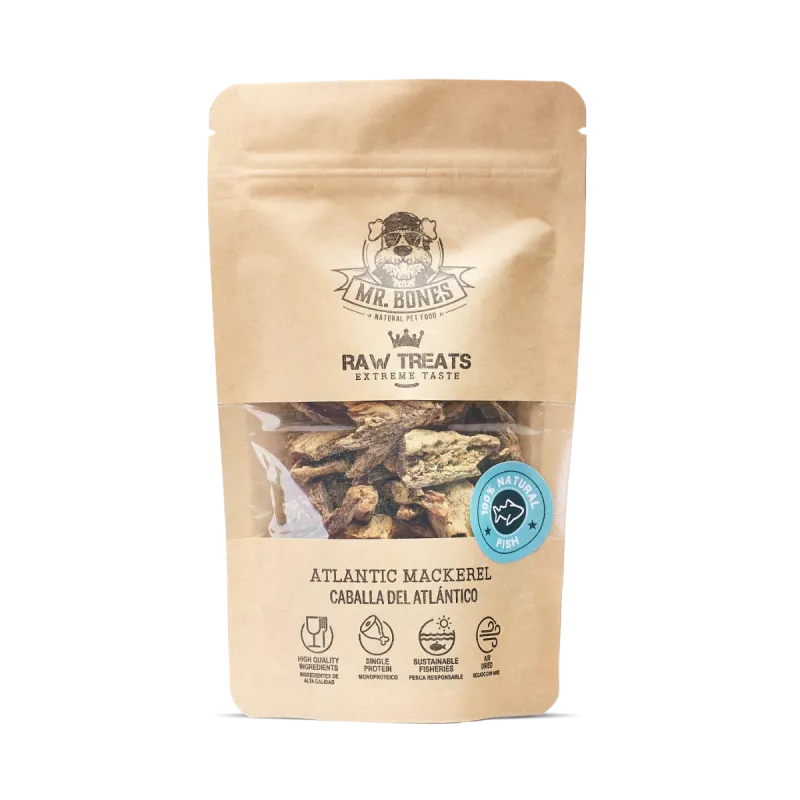 Los Raw Treats de Caballa de Mr. Bones son un snack natural para perros y gatos, elaborado exclusivamente con caballa del Atlántico deshidratada a baja temperatura para conservar mejor sus nutrientes, sabor y aroma natural.