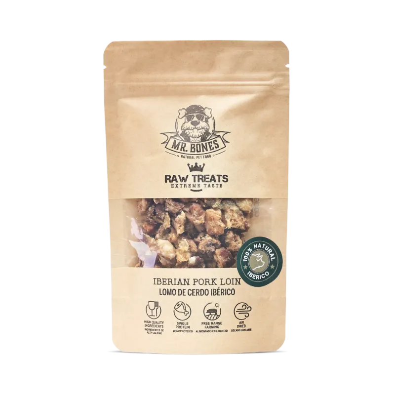 Los Raw Treats de Lomo de Cerdo de Mr. Bones son un snack natural para perros y gatos, elaborado exclusivamente con lomo de cerdo deshidratado a baja temperatura para conservar sus nutrientes, sabor y aroma natural.