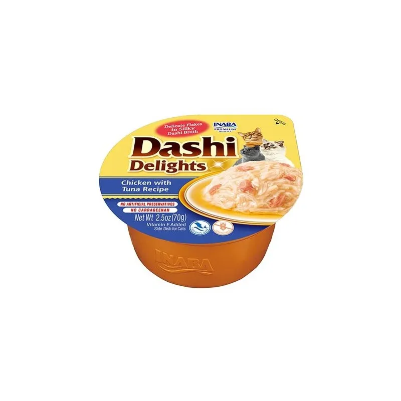 Dashi Delights de pollo con atún para gatos es un caldo de pollo y pescado tradicional japonés a base de hojuelas de atún listado, famoso por su rico sabor.
