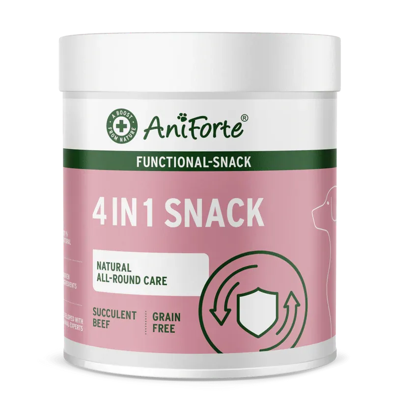 AniForte 4in1 Snack combina ingredientes naturales cuidadosamente seleccionados que trabajan en conjunto para ofrecer un soporte completo al organismo del perro:
