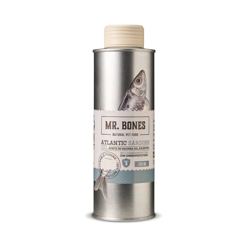 El Aceite de Sardina con Condroprotectores de Mr. Bones es un suplemento natural diseñado para enriquecer la alimentación diaria de perros y gatos de forma sencilla, sabrosa y funcional.