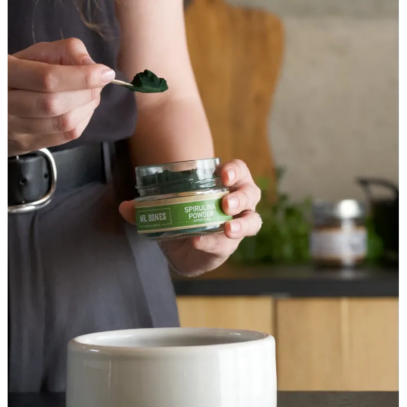 La espirulina de Mr. Bones aporta proteínas vegetales de manera concentrada y contiene de forma natural vitaminas del grupo B, vitamina A, vitamina E y minerales como hierro, calcio y zinc. También incluye compuestos antioxidantes como beta-carotenos y ficocianina, presentes de forma natural en esta microalga. Todo ello la convierte en un complemento muy completo para sumar variedad y riqueza nutricional a la alimentación diaria.
